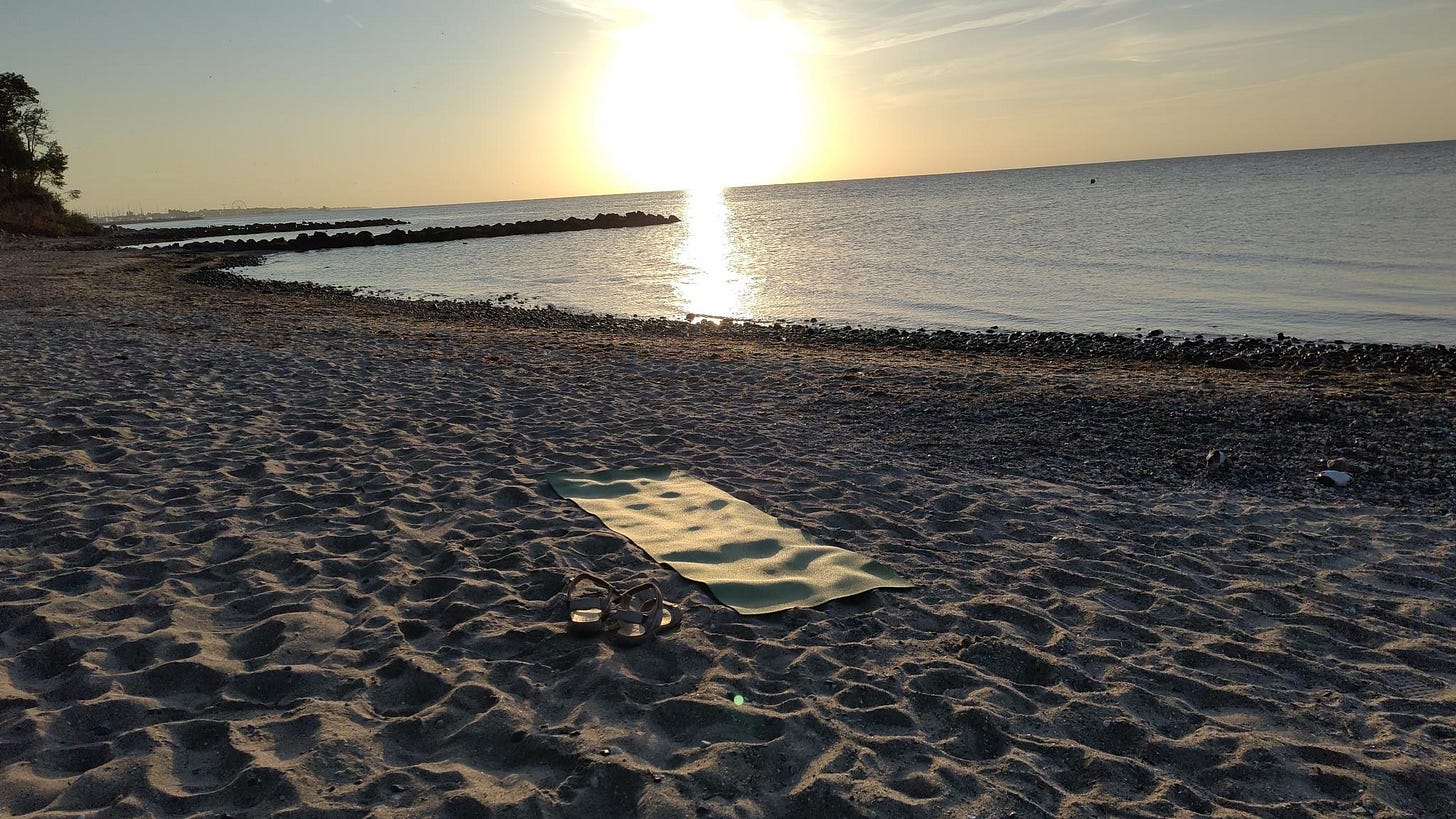 We’re on the last day of our stay here at the Baltic Sea. I already put the bikes back on the rack yesterday. We’ll start the journey home after breakfast. Like on many of the mornings in the past two weeks, I was out on the beach in the morning, to do some Sun Salutations and just sit there to listen to myself.
