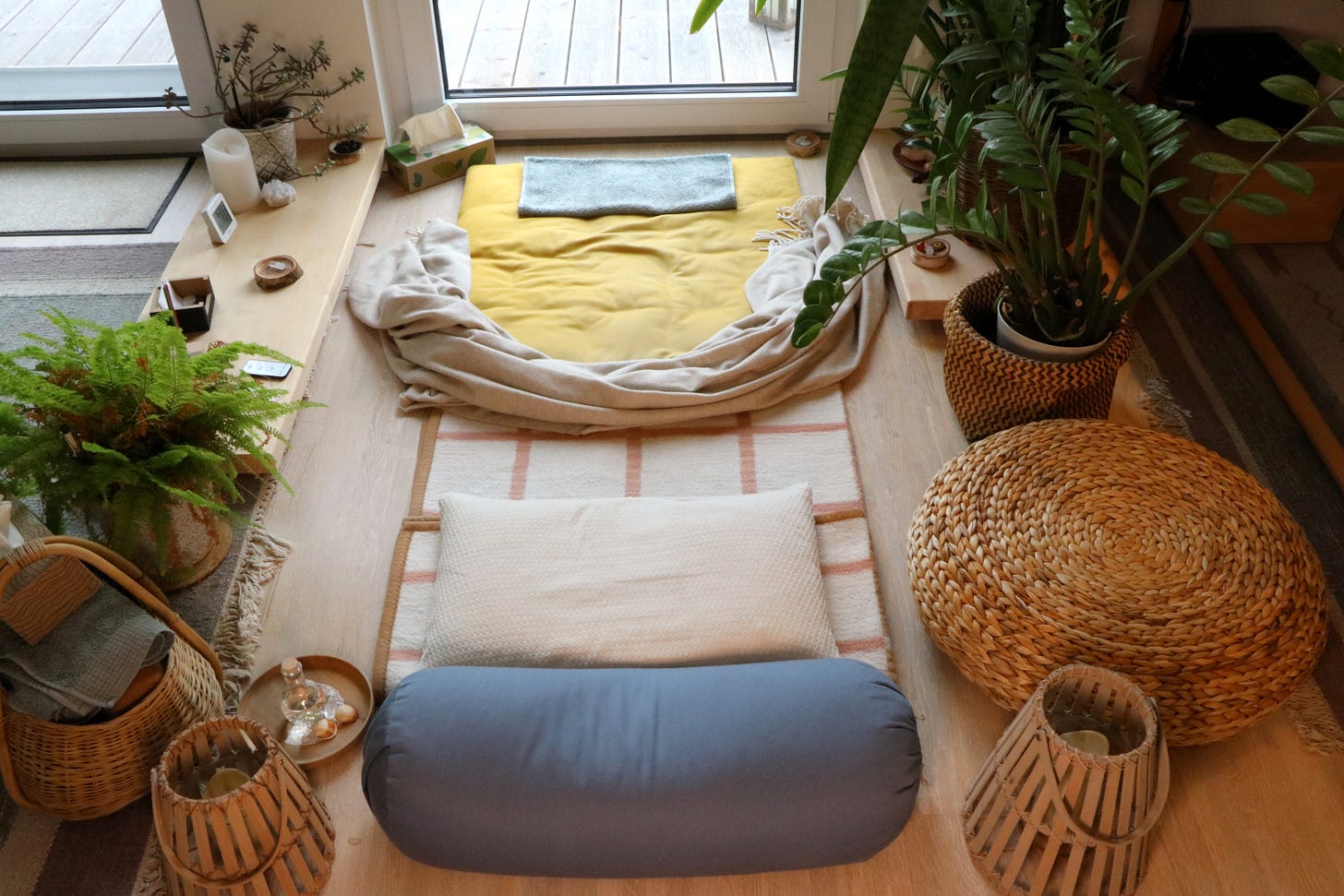 In the picture above, you see my meditation place on a random day. It’s how I left it yesterday night. It conveniently faces east. I read somewhere, that facing east while meditating is good. Also, it is in front of a window, which allows me to see the garden, which is great.